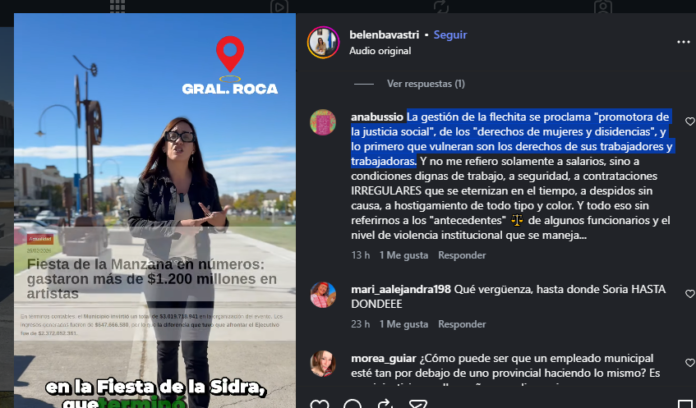 Enseguida se sumaron los comentarios de los internautas: «Después hablan de derechos laborales»; «Lamentable»; «Los municipales merecen un salario digno, no excusas» son las expresiones que más se repiten en Facebook e Instagram donde destacan también lo deficitario que resultaron la ejecución deficitaria de la Fiesta de la Manzana y de la Sidra, que consideraron gastos superfluos.