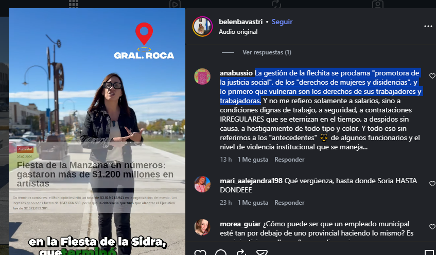 La Concejal se queja además del fuerte déficit de más de cinco mil millones de pesos anuales de la gestión Soria, haciendo eje en lo que se declara y la realidad lo que suma más disensos en redes: Afirmaciones como «Decir que no hay plata mientras se gasta en otras cosas es faltar a la verdad» o, «La gestión de la flechita se proclama «promotora de la justicia social», de los «derechos de mujeres y disidencias», y lo primero que vulneran son los derechos de sus trabajadores y trabajadoras» se repiten en los comentarios.