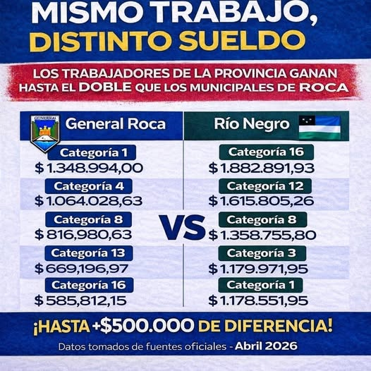 Es que, según los datos publicados por la edil de Juntos hay casi 600 mil pesos de diferencia -poco más que el doble- en la categoría más baja y la diferencia en pesos se mantiene hasta las categorías más altas. Teniendo en cuenta que en la Argentina de Milei de 2026, una familia tipo (dos adultos y dos niños) necesita superar los $1.434.463 mensuales para no ser considerada pobre, los sueldos de los municipales roquenses -de los más alto a los más bajos- se situan bajo esa línea.